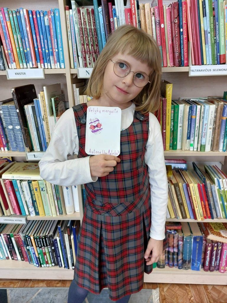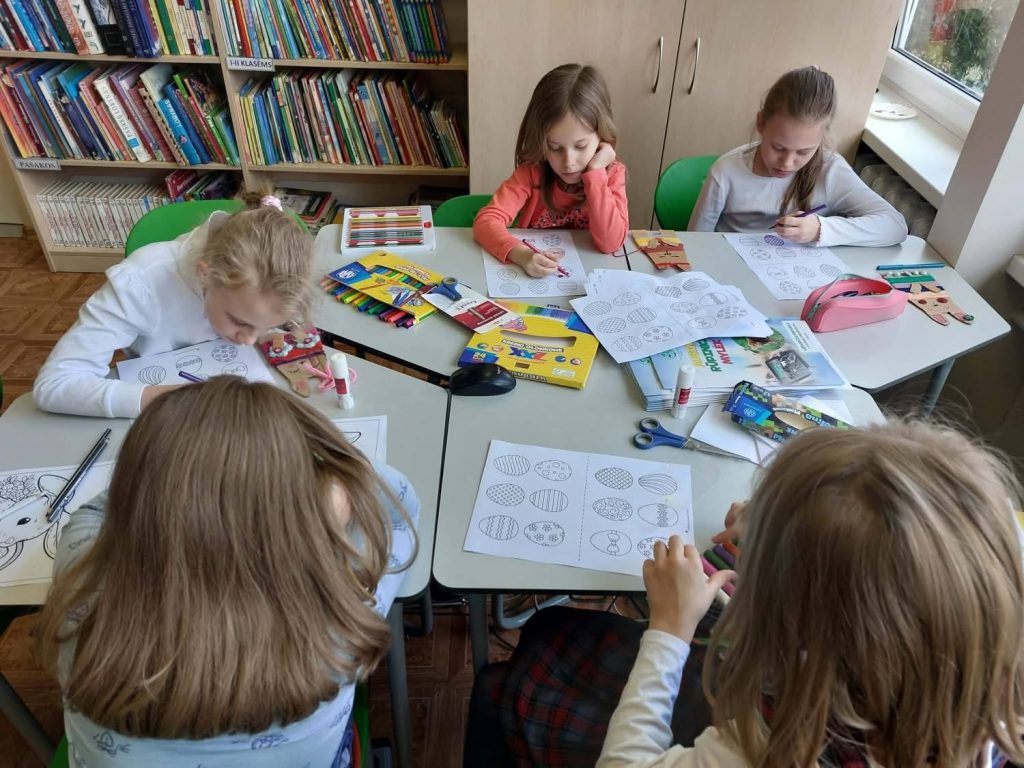 Kovo 20 d., penktadienį, vaikai tradiciškai rinkosi į popietę bibliotekoje. Šį kartą popietės tema buvo artėjančios Velykos. Renginį pradėjome pokalbiu apie Velykų šventę – aptarėme jos prasmę, tradicijas, kalbėjomės apie margučių dažymą, jų simboliką bei Velykų ryto papročius. Vaikai dalijosi savo patirtimi, kaip šią šventę mini namuose su šeima.
