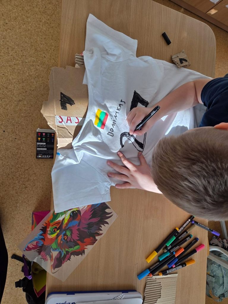 2c klasės mokiniai technologijų pamokoje suteikė antrą gyvenimą suteptiems ar jau nepatinkantiems marškinėliams. Dekoruodami juos tekstiliniais flomasteriais ir termo lipdukais, vaikai mokėsi antrinio žaliavų panaudojimo, kūrybiškai prisidėjo prie tvarumo idėjų puoselėjimo bei aplinkos saugojimo.
