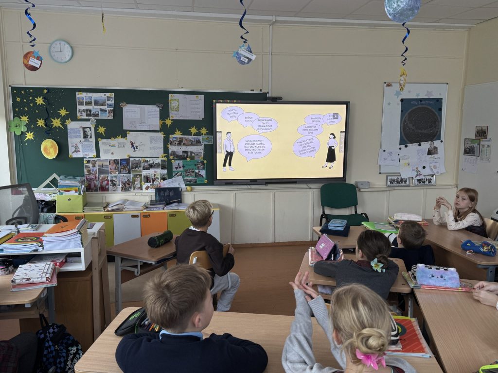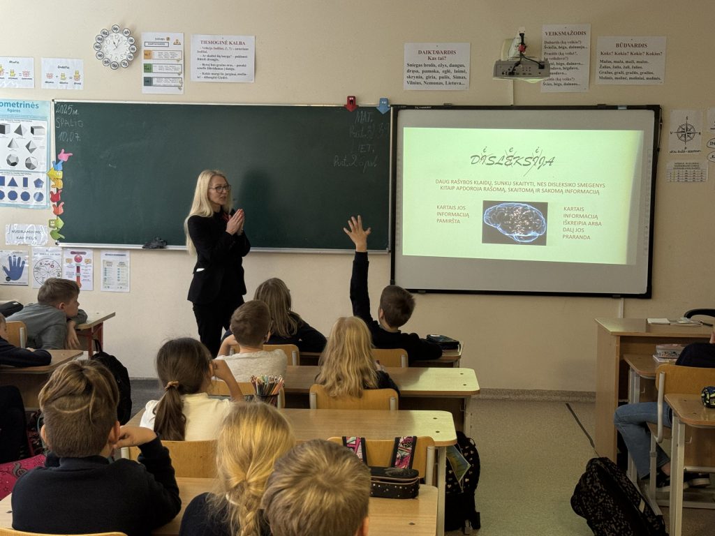 Tad skleidėme žinią apie disleksiją ir spalio 7, 8 dienomis trečiose ir ketvirtose klasėse logopedė Rima ir specialioji pedagogė Greta pristatė trumpai apie disleksiją ir kvietė mokinius sudalyvauti skaitymo ir rašymo iššūkiuose.